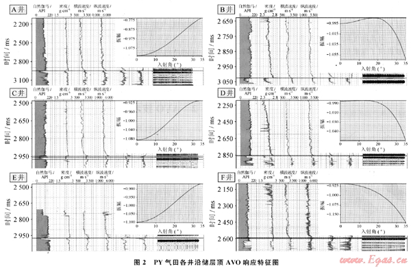 從圖2中可見:PY地區(qū)構(gòu)造圈閉內(nèi)的井(A井、C井、E井)氣層頂表現(xiàn)為振幅隨偏移距增大而減小的趨勢;復(fù)合圈閉內(nèi)的含氣砂巖(D井、F井)則表現(xiàn)為振幅隨偏移距增加而增大的特征,不同圈閉類型的儲層AV0響應(yīng)特征不同的根本原因在于坡折帶上沉積環(huán)境不同,導(dǎo)致泊松比關(guān)系不同,從而影響到AV0響應(yīng)特征;含水砂巖(B井)則表現(xiàn)為振幅隨偏移距增加而增大的含氣的特征。因此,在研究區(qū)用AV0技術(shù)預(yù)測儲層的含油氣性具有很大的不確定性。