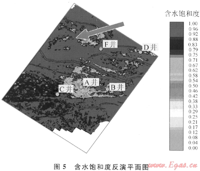 對比反演結(jié)果圖,發(fā)現(xiàn)圖4指示的含氣范圍(黃色區(qū)域)、氣水界面以及與各井含油氣性與實鉆結(jié)果吻合。需要強調(diào)的是:該技術(shù)對B井的預(yù)測與實鉆結(jié)果吻合,更接近地質(zhì)認(rèn)識。但是PY地區(qū)F井北部有一處面積達20km2的高含氣區(qū)(箭頭所示),需要進一步評價、落實該地區(qū)的含油氣性。