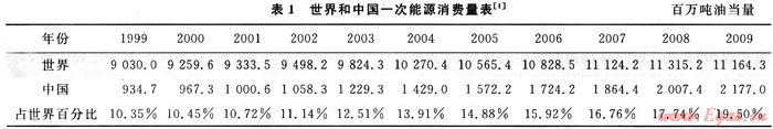 世界一次能源消費量除2009年的金融危機造成下降外,其他各年均逐漸上升,10年總計上升了12.4%。中國的一次能源消費量,一直處于上升狀態(tài),金融危機也沒有影響其上升的勢頭(表1),10年總計上升了133%。中國的一次能源消費量從1999年占世界的10.3%提高到2009年的19.5%,共提高了9.2個百分點,成為全球一次能源消費量增長最快的國家。中國正處于工業(yè)化和城市化發(fā)展階段,未來一次能源消費量仍將快速增長,對中國能源供給能力產生了巨大的壓力,化石能源消費量在相當長的時間內仍將增長。