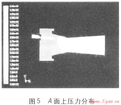 圖5為引射器A面上壓力分布。為了很好地顯示引射器內(nèi)部壓力狀況,著重體現(xiàn)了5Pa以下的壓力分布。在吸氣收縮管內(nèi)壓力接近于0Pa,與外界壓力相當(dāng)。經(jīng)過喉部,在擴(kuò)壓管部分壓力逐漸平穩(wěn)增加,而且每個橫斷面上的壓力分布非常均勻。最終在擴(kuò)壓管出口壓力達(dá)到5Pa,以克服氣流在燃燒器頭部的阻力。