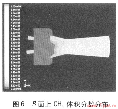 圖6為引射器B面上CH4的體積分?jǐn)?shù)分布。在噴嘴內(nèi)CH4體積分?jǐn)?shù)為100%。在吸氣收縮管內(nèi),CH4體積分?jǐn)?shù)逐步增加,并引射一部分空氣進(jìn)入引射管。經(jīng)過喉部后,在擴(kuò)壓管部分,CH4與空氣混合均勻,體積分?jǐn)?shù)趨于穩(wěn)定。
