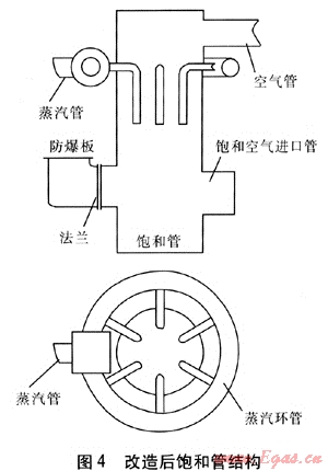 改變蒸汽進(jìn)入飽和管的方式,首先在飽和管外部加1根管徑為100mm的環(huán)形管,環(huán)形管上接1段長度為200mm、直徑為200mm的緩沖管,使蒸汽在緩沖管內(nèi)得到緩沖,然后將蒸汽由6根直徑為40mm的支管引入飽和管,在每根支管上分別鉆12個直徑為14mm的孔(靠飽和管內(nèi)壁一側(cè)不鉆孔),支管末端出口用盲板堵住。改造后飽和管結(jié)構(gòu)見圖4。通過以上改造,實現(xiàn)了蒸汽和空氣的充分混合,提高了氣化劑的品質(zhì),從而改善了爐內(nèi)氣化狀況。
