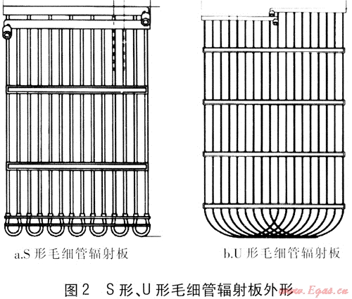 S形、U形毛細管輻射板外形見圖2。S形毛細管輻射板比較常用,它是由供回水主管和若干毛細管組成的。毛細管外徑為4.3mm,標準間距為20mm,還可以根據要求進行調整。管材可采用無規(guī)共聚聚丙烯管(PP-R管)、耐熱聚乙烯管(PE-RT管)、聚丁烯管(PB管)。安裝方式有隱蔽式、半隱蔽式:隱蔽式是將毛細管輻射板安裝在圍護結構內部;半隱蔽式是將毛細管輻射板安裝在圍護結構表面,采用裝飾物遮擋。