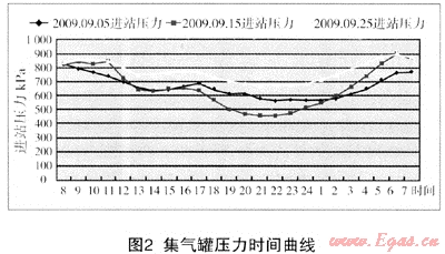 (2) 省公司對(duì)寶雞中燃實(shí)行均衡供氣。寶雞中燃用球罐進(jìn)行日調(diào)峰,大多都是晚上進(jìn)氣,白天出氣模式。匯一集氣罐上2009.09.05,2009.09.15,2009.09.25三天時(shí)間壓力曲線如圖2,基本上反映出匯一集氣罐壓力時(shí)間曲線。