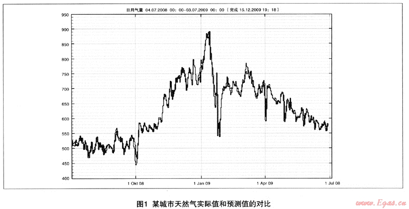 如同任何事件的發(fā)生一樣,天然氣供銷差的變化也是有一定預(yù)兆的,城市燃?xì)庳?fù)荷預(yù)測(cè)的及時(shí)與準(zhǔn)確對(duì)于“氣荒”的緩解有著重要的作用。國(guó)內(nèi)有的學(xué)者對(duì)于城市燃?xì)庳?fù)荷的長(zhǎng)期、中期、短期預(yù)測(cè)技術(shù)進(jìn)行了大量研究,取得了可喜的進(jìn)展,在若干城市已經(jīng)實(shí)際應(yīng)用[18]。德國(guó)在貫徹歐洲議會(huì)和理事會(huì)保障安全節(jié)能的天然氣供應(yīng)的法規(guī)時(shí),要求各城市燃?xì)馍蠄?bào)未來3天的用氣量預(yù)測(cè)誤差控制在5%以內(nèi)。此舉促進(jìn)了燃?xì)忸A(yù)測(cè)方案的發(fā)展,對(duì)國(guó)內(nèi)燃?xì)獾念A(yù)測(cè)工作有借鑒意義[19]。國(guó)內(nèi)某城市的燃?xì)庥脷饬拷?jīng)德國(guó)慕達(dá)燃?xì)忸A(yù)測(cè)系統(tǒng)的分析,在給出了1年的用氣量和天氣數(shù)據(jù)的前提下,7天內(nèi)的預(yù)測(cè)誤差為1.75%,實(shí)際值和預(yù)測(cè)值的對(duì)比曲線見圖1。如能利用燃?xì)庳?fù)荷預(yù)測(cè)技術(shù)對(duì)于氣象干擾的影響能準(zhǔn)確的預(yù)測(cè),加上及時(shí)的調(diào)度,對(duì)于天然氣供應(yīng)系統(tǒng)“氣荒”的避免將具有重要的意義。