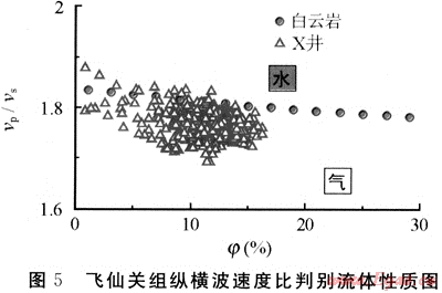 對(duì)以孔隙為主的白云巖或石灰?guī)r儲(chǔ)層來(lái)說(shuō),如果縱橫波速度比值落在白云巖或石灰?guī)r線以下,解釋為氣;反之,解釋為水。飛仙關(guān)組和長(zhǎng)興組經(jīng)過(guò)巖性校正后縱橫波速度比與孔隙度的交會(huì)點(diǎn)主要分布于白云巖線以下方,表明流體類(lèi)型為氣層(圖5),與該段測(cè)試產(chǎn)氣相符合。