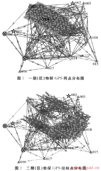 基于以上諸多因素,提出了“首級(jí)控制、分期(區(qū))布網(wǎng),首分網(wǎng)整體平差”的施工原則。即:首先在整個(gè)工區(qū)建立GPS骨架網(wǎng),根據(jù)施工順序在骨架網(wǎng)基礎(chǔ)上分兩期(區(qū))進(jìn)行GPS控制點(diǎn)加密;兩期(區(qū))加密GPS網(wǎng)分別連接骨架網(wǎng)的布測數(shù)據(jù)進(jìn)行平差處理。這樣既能及時(shí)提供施工所需的物探控制點(diǎn),又能保證整個(gè)網(wǎng)點(diǎn)精度的一致性。