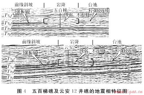 通過圖4五百梯礁以及云安12井礁等地震剖面分析,由圖4可見,對長興組生物礁識別方法歸納如下:①生物礁礁前至前緣斜坡-海槽相剖面段,長興組頂界反射能量明顯增強;且互相獨具有良好的連續(xù)性和光滑性,在生物礁礁后至臺地相,其反射層振幅雖較前緣斜坡,海槽相弱,但連續(xù)性明顯優(yōu)于生物礁(灘)段反射。正是由于其區(qū)域地震相特征,顯示并指示出生物礁(灘)發(fā)育的剖面具體位置。②臺緣生物礁均發(fā)育在前緣斜坡-臺地間的坡折處,常與海槽相平行,相帶相對狹窄。③礁前、礁后地震相(包括振幅、連續(xù)性等)屬性發(fā)生橫向突變現(xiàn)象。④礁體自身地震相(如反射外形、振幅、連續(xù)等屬性),由于局部沉積環(huán)境不同存在一定差異,但都具有反射絮亂,不連續(xù)的基本特征。⑤其分布完全與現(xiàn)今構(gòu)造的展布無關(guān)。需要指出的是,垂直臺地-海槽相帶的地震測線其預(yù)測可靠性相對更高。
