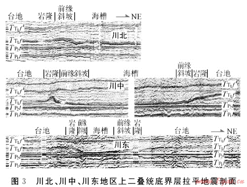 地震相是以反射波的頻率、振幅、相位、時差及反射外形等屬性來反映地層物性變化的。通過地震相研究表明,在眾多地震屬性中,反射振幅、層間時差和反射外形結(jié)構(gòu)(如平行、上超、下超、前積等)是識別四川盆地臺地-海槽沉積相的區(qū)域橫向變化較為實用的幾個屬性標(biāo)志。