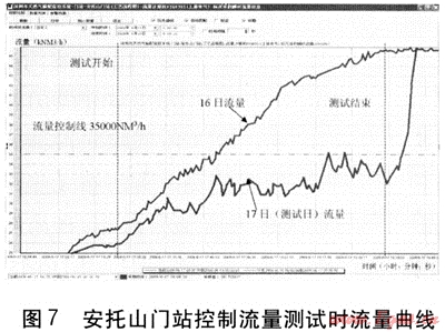 目前兩座門站沒有設(shè)置限流裝置,上游也沒有對門站采取限流。當出站壓力保證穩(wěn)定,不采取降壓以利用次高壓管道的管道儲氣的情況下,在用氣高峰時段,流量超過合同規(guī)定的最大提取速率,超過最大提取速率提取的氣量將按正常價格的150%計價。針對以上實際情況,將壓力遙調(diào)的功能進行拓展,通過在高峰時段降低出口壓力,減小調(diào)壓器開度,從而間接地降低流量。在高峰時段需頻繁降壓,將流量控制在上游要求的最大提氣速率的95%以內(nèi),用戶需求的不足部分通過降低管道壓力、利用管道儲氣來補充。低峰時升高壓力來補充管道儲氣。這種頻繁的調(diào)整,在沒有遙調(diào)系統(tǒng)的情況下是很難實現(xiàn)的。圖7、8為改造后安托山門站晚高峰控制流量測試時的流量、壓力曲線。