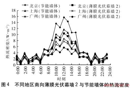 經(jīng)計(jì)算可得,不同地區(qū)南向薄膜光伏幕墻2與節(jié)能墻體的熱流密度見圖4。相比薄膜光伏幕墻1,節(jié)能墻體結(jié)合薄膜光伏組件后的節(jié)能率較低,經(jīng)計(jì)算得,節(jié)能率可達(dá)34%。