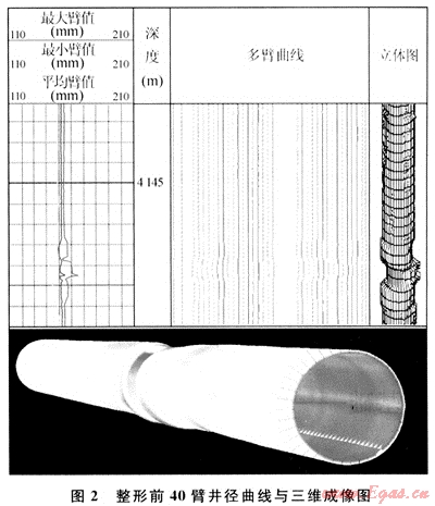 為了檢驗(yàn)整形效果和了解整形后套管回彈情況,整形24h后用40臂井徑測井儀器復(fù)測,整形段套管內(nèi)徑變化對(duì)比見表1。從表1中可以看出,套管變形嚴(yán)重井段4148.0~4148.6m的長軸徑值縮短1.3~3.6mm;短軸徑值增加2~9.7mm,具有較明顯的整形效果;井段4148.9~4149.3m整形效果不理想,該處為套管接箍,分析存在套管整形毛刺。