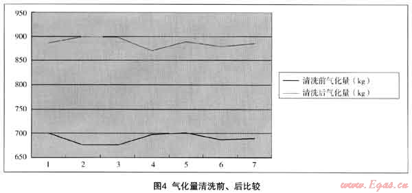 以我司新城氣化站一臺日本神樂1000kg/h氣化爐清洗前、后一周高峰用氣作比較(見表5、圖4)。