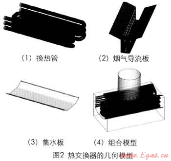 熱交換器的幾何模型如圖2。利用Gambit創(chuàng)建三維物理模型并劃分網(wǎng)格。排煙管的對稱結(jié)構(gòu)相對簡單,其中的氣流變化較緩慢,網(wǎng)格參數(shù)的間距尺寸取為0.005mm;其余部分的網(wǎng)格參數(shù)的間距尺寸城小為0.002mm。總共約劃分7917萬個(gè)網(wǎng)格。