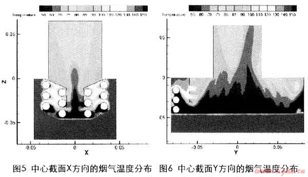 兩個(gè)垂直的中心截面沿X方向和Y方向的煙氣溫度分布如圖5和圖6。從圖中可以看出,由于煙氣流過下部換熱管的流速較小,所以換熱量較大,管后的溫度也較低。煙氣通過左右對稱的四排管子傳遞熱量,完成傳熱過程。排煙管出口的煙氣溫度比較均勻。計(jì)算得到排煙平均溫度為76.4℃,出水溫度為21.33℃,換熱管的傳熱計(jì)算總面積為0.088m2,總傳熱量為1213W,綜合傳熱系數(shù)較高:K=137W/m2.℃。