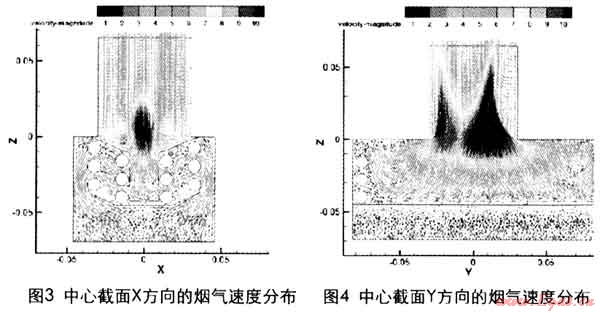 兩個(gè)垂直的中心截面沿X方向和Y方向的煙氣速度分布如圖3和圖4。從圖中可以看出流過換熱管的煙氣速度總體還比較均勻,下部換熱管由于阻力較大因而速度稍小。在排煙管的中心區(qū)域,由于截面收小,所以氣流速度較大。但到出口處基本上混合均勻。計(jì)算得到煙氣進(jìn)口的平均速度為1.11m/s,煙氣出口的平均速度為5.37m/s。