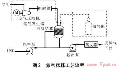 利用氮?dú)庀♂屖钦{(diào)節(jié)熱值的重要手段,也是傳統(tǒng)的重?zé)N去除工藝之一,氮?dú)庀♂尮に嚵鞒桃妶D2。原料LNG經(jīng)原料泵增壓后進(jìn)入再凝結(jié)器,在再凝結(jié)器中與氮?dú)?從空氣中提純或取自氮?dú)馄?混合,再經(jīng)輸出泵增壓,經(jīng)蒸發(fā)器輸出。氮?dú)庀♂尮に囍械妮敵霰脡嚎s過程為液體壓縮,相比蒸餾塔分離工藝中的氣體壓縮,可以節(jié)省大量的電能,但是增加了昂貴的氮?dú)獍l(fā)生器或氮?dú)夤?yīng)系統(tǒng)。此外,如果氮?dú)獾臏囟炔粔虻停琇NG與N2的混合過程和液體壓縮過程中將會(huì)產(chǎn)生大量的熵增。