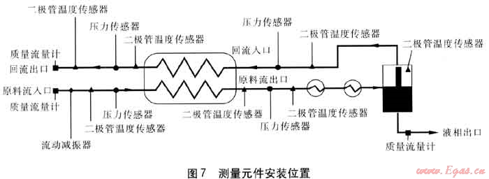 d. 測(cè)量及數(shù)據(jù)采集系統(tǒng)。溫度、壓力、流量測(cè)量元件安裝位置見圖7。測(cè)量數(shù)據(jù)均通過數(shù)據(jù)線上傳至計(jì)算機(jī),采用LABVIEW 8.2軟件進(jìn)行采集、記錄。