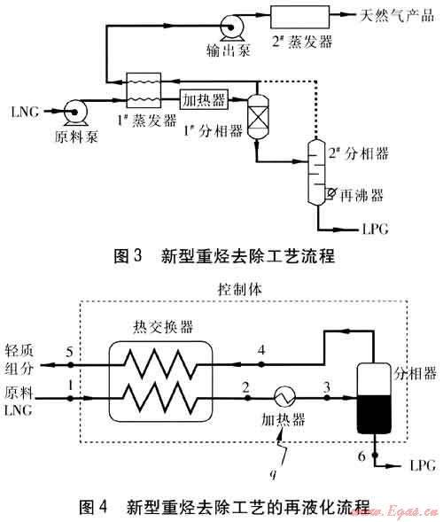 本文提出一種不同于以往的新型重?zé)N去除工藝:將過冷態(tài)LNG的冷能用于凝結(jié)從分相器內(nèi)重組分中蒸餾分離出來的輕質(zhì)LNG組分[1]。目前LNG的冷能利用[2~7]主要有:冷能發(fā)電、空氣分離、冷凍倉(cāng)庫(kù)、液化二氧化碳、熱電循環(huán)等。本文將冷能的應(yīng)用范圍擴(kuò)大至再液化流程。