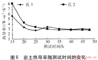 ③ 在實際測試中,采用線熱源模型進行熱響應(yīng)測試,測試至少要進行45h才能計算得到穩(wěn)定合理的巖土熱導(dǎo)率。