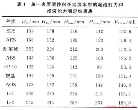 為了研究單一表面活性劑對(duì)地層水的起泡能力和攜液能力,用傾注法測定了室內(nèi)自制表面活性劑L-1和L-2以及市面銷售的表面活性劑十二烷基本磺酸鈉(ABS)、α-烯基磺酸鈉(AOS)、脂肪醇聚氧乙烯醚硫酸鹽(AES)、十二烷基磺酸鈉(SDS)、辛基酚聚氧乙烯10醚(OP-10)、甜菜堿和銨鹽的起泡能力和攜液能力,并記錄了0s、30s、3min和5min的泡沫高度及15min的泡沫攜液量(表1)。實(shí)驗(yàn)泡排劑溶液濃度為0.5%,總液體量為200mL,地層水礦化度為4.7×104mg/L,水型為CaCl2型,實(shí)驗(yàn)溫度為30℃。