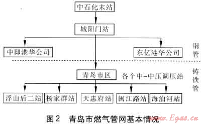青島市燃氣管網(wǎng)的基本情況見圖2。市區(qū)所使用的天然氣主要來自中石化末站,經過城陽門站計量后,分別供給青島市區(qū)、中即港華公司和東億港華公司。中即港華公司和東億港華公司所建管網(wǎng)全部采用鋼管,不存在接口漏氣現(xiàn)象,因此不需要加濕。進入市區(qū)的天然氣先經過21km輸氣管道后分到各中-中壓調壓站,經調壓后進入中壓B管網(wǎng)。這21km輸氣管道也全部是鋼管,因此也不存在接口漏氣現(xiàn)象。