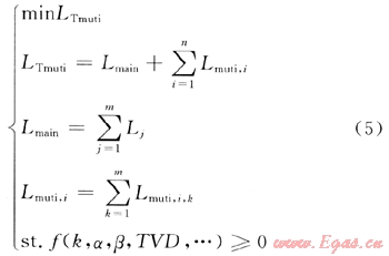 根據(jù)不同的主井眼類(lèi)型選用不同的井深計(jì)算方法和限制條件[9],聯(lián)合不同的分支井眼井深計(jì)算和限制條件就可以組合為分支水平井軌道優(yōu)化的數(shù)學(xué)模型,由此能夠建立出目標(biāo)函數(shù)[10]——使得整個(gè)軌道長(zhǎng)度為最小。分支水平井設(shè)計(jì)優(yōu)化模型為: