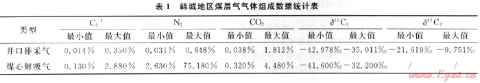 通過(guò)對(duì)韓城地區(qū)煤層氣演化過(guò)程分析,該區(qū)煤層熱演化程度較高,煤層氣主要以熱成因氣為主,盡管在后期改造作用中研究區(qū)的東部煤層出露于地表,可能遭受大氣降水等因素的影響,但煤層氣碳同位素值(通常把δ13C1<-55‰認(rèn)為是生物成因氣)的特征表明并沒(méi)有生物氣的混入。