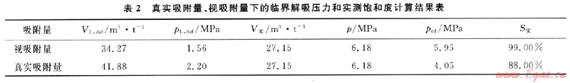 計算結(jié)果表明:真實(shí)吸附量情況下的臨界解吸壓力和實(shí)測飽和度要小于視吸附量情況下的臨界解吸壓力和實(shí)測飽和度,視吸附量情況下的臨界解吸壓力為5.95MPa,而真實(shí)吸附量情況下的臨界解吸壓力為4.05MPa,兩者相差1.90MPa。