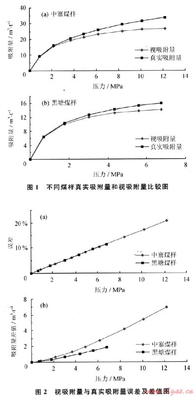 2) 煤層甲烷隨吸附壓力的增大,真實(shí)吸附量與視吸附量差值也越大,誤差也越大;同時發(fā)現(xiàn)煤層吸附性越強(qiáng),真實(shí)吸附量和視吸附量之間差值也越大。