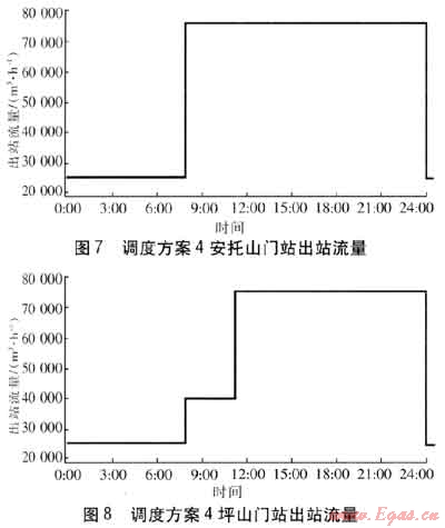 調(diào)度方案4:在安裝了流量遙調(diào)系統(tǒng)情況下,對安托山門站、坪山門站均進(jìn)行流量的遙調(diào)控制。在用氣高峰時段兩門站最大供氣流量分別為7.5×104m3/h,為使次高壓管網(wǎng)最大壓力不超過1.55MPa,低峰時段應(yīng)進(jìn)行供氣流量的限制。安托山、坪山門站的流量見圖7、8。