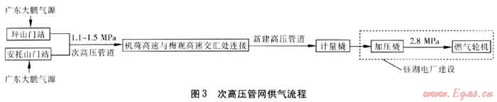 該方案綜合考慮西二氣到來后將使用的天然氣高壓管道與目前的天然氣次高壓管道,利用已建成的高壓管道與次高壓管道連接,通過次高壓管道供應(yīng)電廠。高壓管道的設(shè)計壓力為6.0MPa,運行壓力為4.0MPa;次高壓管道的設(shè)計壓力為1.6MPa,門站出站運行壓力為1.5MPa。在建的機(jī)荷高速、坂雪大道、環(huán)觀南路、平大路的高壓管道與煙廠調(diào)壓站后梅觀高速的次高壓管道連通后,即可通過該管道供應(yīng)電廠,全長約13.6km,其中尚需建設(shè)部分為6.42km,從工期上來說,可以滿足需求。電廠內(nèi)需建設(shè)計量橇、加壓橇。工藝流程見圖3。