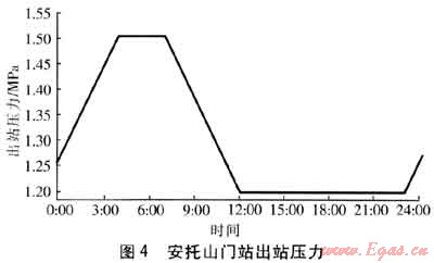 根據(jù)統(tǒng)計的歷史數(shù)據(jù),預(yù)測供氣期間最大用氣日24h各用氣點的用氣情況,比選的方案均按相同的用氣情況。調(diào)度方案1、2中,坪山門站的出站壓力設(shè)為定值1.5MPa,安托山門站的出站壓力按圖4調(diào)整。