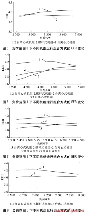 由圖4可知,當(dāng)負(fù)荷范圍為1167~2637kW時(shí),只開(kāi)啟1臺(tái)離心式機(jī)組,冷水系統(tǒng)的效率將會(huì)達(dá)到最高,此時(shí)EER為3.70~4.22。由圖5可知,當(dāng)負(fù)荷范圍為2637~2910kW時(shí),初期開(kāi)啟螺桿式機(jī)組+1臺(tái)離心式機(jī)組的EER略高于開(kāi)啟2臺(tái)離心式機(jī)組,但隨著負(fù)荷的增加,開(kāi)啟2臺(tái)離心式機(jī)組的EER將會(huì)逐漸增大至4.13,遠(yuǎn)高于開(kāi)啟螺桿式機(jī)組+1臺(tái)離心式機(jī)組。由于負(fù)荷范圍2637~2910kW運(yùn)行時(shí)間較短,在實(shí)際運(yùn)行中,負(fù)荷范圍為2637~3804kW時(shí),采用開(kāi)啟2臺(tái)離心式機(jī)組的方案。此時(shí),冷水系統(tǒng)的EER為3.78~4.13。由圖6可知,當(dāng)負(fù)荷范圍為3804~5274kW時(shí),采用開(kāi)啟2臺(tái)離心式機(jī)組的方案,冷水系統(tǒng)EER最高。由圖7、8可知,當(dāng)負(fù)荷范圍為5274~7911kW時(shí),應(yīng)開(kāi)啟3臺(tái)離心式機(jī)組,此時(shí)冷水系統(tǒng)的效率最高。冷水機(jī)組最佳運(yùn)行組合方式見(jiàn)表3。