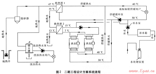 二期工程設(shè)計方案的系統(tǒng)流程見圖2。地?zé)崴槌龊?,?jīng)過除砂器進入板式換熱器1,將30℃地板輻射供暖系統(tǒng)回水加熱至40℃。經(jīng)過板式換熱器1的35℃地?zé)崴?jīng)板式換熱器2由熱泵提取熱量,作為熱泵的低溫?zé)嵩础5責(zé)嵛菜疁囟葹?3℃。