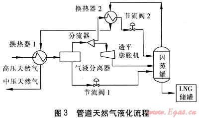 高壓天然氣經換熱器1預冷部分液化后,進入氣液分離器,分離出的液相經節(jié)流閥膨脹至中壓,溫度降低,形成氣液混合物。分離出的氣相經分流器分為兩股,一股進入膨脹機膨脹至中壓,溫度劇降,形成氣液混合物;另一股經換熱器2預冷部分液化后,再經節(jié)流閥膨脹至中壓后,也形成氣液混合物。三股氣液混合物一起送到閃蒸罐中,分離出氣相天然氣(中壓)和LNG,前者作為原料氣預冷冷源,換熱后進入中壓管網(wǎng),后者進入LNG儲罐儲存。在城市門站安裝帶膨脹機的天然氣液化裝置,用氣低谷時通過膨脹機產生冷量用于天然氣液化。生成的LNG輸入儲罐,用氣高峰時將其氣化起到調峰作用。