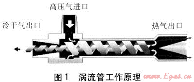 以只輸入一定壓力的壓縮空氣為例,通過渦流管處理,一端產生冷空氣(在干燥空氣的前提下最低溫度可達-46℃),另一端產生熱空氣(最高溫度可達127℃)。利用冷、熱端氣體溫度的不同,可分別提供制冷或加熱,使能量得到充分利用。渦流管制冷效果介于節(jié)流閥和膨脹機之間。