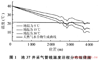 圖1為池37井在井口溫度為40℃時,不同地溫下的沿程溫度分布及天然氣水合物生成曲線圖。從圖上可以看到管線高程對管線沿線壓力、溫度影響非常大,而且隨著管線位置變化,壓力的變化引起各點的天然氣水合物生成溫度也發(fā)生了變化。管線進站溫度最低,并不是在此處形成的天然氣水合物溫度最低,因此進行管線設(shè)計時要綜合考慮預(yù)測天然氣水合物形成溫度,不能僅以終點不形成天然氣水合物,就認(rèn)為管線沿程都不生成天然氣水合物。