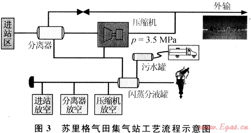 集氣站內(nèi)主要設(shè)備有氣液分離器、壓縮機(jī)組、污水罐和清管器收發(fā)球筒等設(shè)備。其工藝流程見圖4。