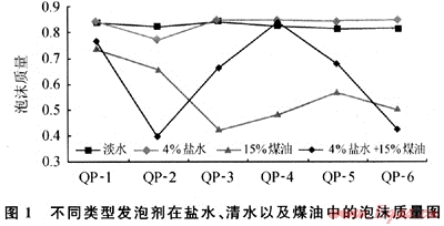 實(shí)驗(yàn)分別考察了不同種類起泡劑在清水、鹽水、煤油以及鹽水和煤油的共同作用下的泡沫質(zhì)量。結(jié)果表明非離子表面活性劑QP-1的效果最佳,鹽、油對(duì)其泡沫質(zhì)量的影響小,其值均在0.75以上,故實(shí)驗(yàn)優(yōu)選QP-1作為抗油防塌泡沫體系的發(fā)泡劑。