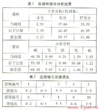 各煤樣的成分分析結(jié)果(質(zhì)量分?jǐn)?shù))見表l。由表1可知,烏峰煤揮發(fā)分最低,灰分最高。各種混煤編號(hào)及摻混比(質(zhì)量比)見表2,其中混煤1~5為烏峰煤與石下江煤的混煤,混煤6~10為烏峰煤與新東煤的混煤。