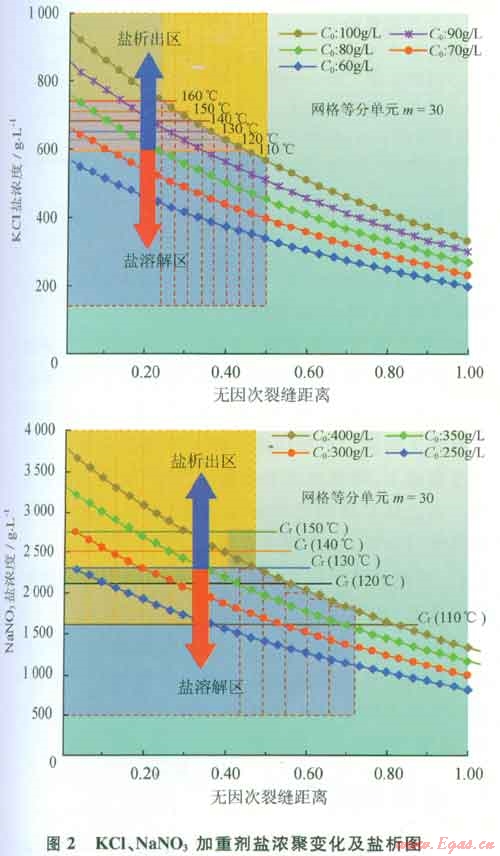 采用以上模擬原則,以KCl、NaN03加重液為例,分析加重液在高溫高壓氣藏增產(chǎn)過程中鹽析過程。圖2是KCl、NaN03模擬鹽濃聚變化和鹽析結(jié)果圖。從圖可看出,即使地面使用加重液鹽度遠(yuǎn)低于該溶液的臨界飽和溶解度,但在高溫地層返排過程中加重液經(jīng)過逐漸濃聚后極易產(chǎn)生鹽析。如采用70g/L的KCl鹽水和250g/L的NaN03鹽水,20℃時其臨界飽和溶解度分別為254.8g/L和467g/L,但在高溫地層返排過程中經(jīng)過逐漸濃聚后,在距裂縫壁附近液體鹽度可高達(dá)620g/L和2000g/L以上,超過溫度110℃時兩者的臨界飽和鹽度(其臨界飽和鹽度分別為600g/L和1940g/L),部分鹽將從溶液中結(jié)晶析出,即產(chǎn)生鹽析現(xiàn)象。該濃度低于130℃時兩者的臨界飽和溶解度,因此當(dāng)返排溫度為130℃時,溶液無鹽析現(xiàn)象屬于穩(wěn)定狀態(tài)。
