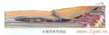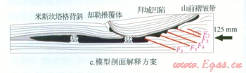 從實際地震剖面與物理模擬的結果對比圖(圖3-b、c)來看,該實驗基本將阿瓦特段的構造變形情況真實地再現了出來,物理模擬的構造形態(tài)與地震剖面基本一致:鹽下發(fā)育4排疊瓦逆沖斷層,與地震剖面一致;物理模擬剖面斷層傾角約30°,地震剖面斷層傾角40°,二者基本吻合。該實驗在邊界條件的設計上和構造變形的過程上與真實情況基本一致,符合相似性原則,可以作為對該地區(qū)構造解釋的有效證據。