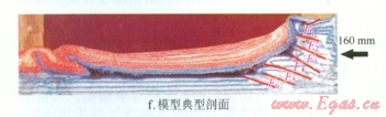 為確定是否存在早期發(fā)育的鹽底辟,還進行了未設計初始鹽底辟的模擬實驗(模型二),模型長60 cm,模擬實際剖面長度為120 km,寬為30 cm。采用同樣的方式進行實驗,得到了實驗結果(圖4-e、f)。
