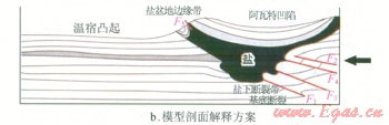 在鹽的滑脫作用下,鹽上層變形與鹽下層變形不協(xié)調。鹽上層主要表現為幅度很小的向斜盆地和推覆距離很大的逆沖推覆體,鹽下前緣斷層在擠壓作用下即開始形成,直至擠壓最終結束,始終在活動。而鹽上負載則在鹽的滑脫作用下推覆至鹽盆地南邊的硬性地層之上,并由于鹽的聚集作用和基底的抬升作用,鹽上