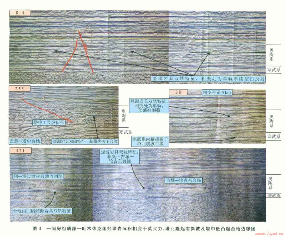 但是,通過對(duì)經(jīng)過羊屋2井地震剖面(測(cè)線419)的精細(xì)分析(圖3),發(fā)現(xiàn)在羊屋2井南部3 km處存在同相軸Tg5-1及其下面的“雙軌”變“單軌”的巖性相變反射,即代表著上奧陶統(tǒng)良里塔格組石灰?guī)r頂面Tg5-1之下的強(qiáng)反射軸發(fā)生相變。同時(shí)經(jīng)多條地震剖面相互閉合、連接確認(rèn),此發(fā)生相變的“雙軌”同相軸與過塔中29井烴源巖發(fā)育位置的強(qiáng)相位反射顯示的是同一套地層發(fā)射。據(jù)此認(rèn)為,中上奧陶統(tǒng)一間房組頂部—吐木休克組烴源巖沉積相變于塔北隆起南斜坡羊屋2井南3 km處的碳酸鹽巖臺(tái)地內(nèi)緩坡。