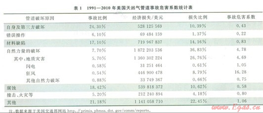 長輸油氣管道沿途的地質(zhì)災(zāi)害種類多、成因復(fù)雜、范圍廣,所導(dǎo)致的管道事故又極易誘發(fā)嚴重的次生災(zāi)害,其直接和間接損失往往比其他類別的事故更大【1-2】。美國交通部數(shù)據(jù)顯示,1991-2010年雖然美國由于地質(zhì)災(zāi)害導(dǎo)致管道破壞的統(tǒng)計頻率僅為5.7%,但是由其帶來的經(jīng)濟損失卻高達l3.6億美元,占全部經(jīng)濟損失的26.76%;如果將“事故危害系數(shù)”(Accident Hazard Index,簡稱AHI)定義為“該類事故損失金額占全部損失的比例”除以“該類事故占全部事故的比例”,并以此對比平均每發(fā)生l次事故所帶來經(jīng)濟損失的大小,可得到l991-2010年美國天然氣管道事故危害系數(shù)統(tǒng)計表(表1)。