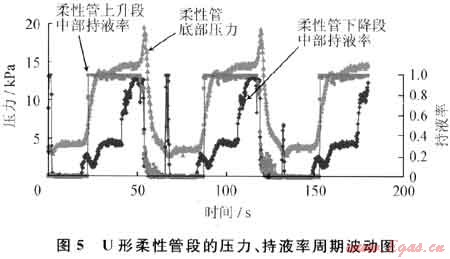 圖5是氣、液相折算速度都為0.30m/s時(shí)U形柔性管的壓力、持液率周期波動圖。在液塞形成階段液塞頭進(jìn)入U(xiǎn)形柔性管之前,U形柔性管內(nèi)少量液體振蕩流動,U形柔性管底部壓力較小并有小幅度的波動。液塞進(jìn)入U(xiǎn)形柔性管后,U形柔性管下降段中部持液率先開始上升,由于下降段傾角較大,液體在下降段為分層流,U形柔性管下降段中部持液率值較小。隨著液塞頭在上升段中生長,U形柔性管底部壓力開始增大,當(dāng)?shù)竭_(dá)上升管探針處時(shí),U形柔性管上升段中部持液率從0變?yōu)?。在液塞生產(chǎn)階段,U形柔性管底部壓力與U形柔性管上升段中部持液率不再增長。隨著液塞不斷流入U(xiǎn)形柔性管,U形柔性管上升段中部持液率慢慢增大。在液氣噴發(fā)階段,由于液塞加速,U形柔性管底部壓力先迅速增大然后迅速減小到最小值,U形柔性管上升段中部持液率迅速增大到1。隨著液塞尾經(jīng)過U形柔性管,液體回落,U形柔性管上升段中部持液率和u形柔性管上升段中部持液率迅速減小直至重新變?yōu)?,開始下一個(gè)嚴(yán)重段塞流周期。