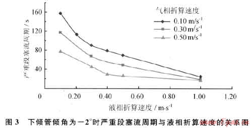 圖3為下傾管傾角為-2°時(shí)嚴(yán)重段塞流周期與液相折算速度的關(guān)系圖。從圖3可以看出嚴(yán)重段塞流周期隨液相折算速度的增大而減小。實(shí)驗(yàn)顯示形成嚴(yán)重段塞流時(shí)下傾管為分層流。液相折算速度增大時(shí),下傾管持液率增加,氣相空間相應(yīng)減小,相同時(shí)間內(nèi)氣相壓力增加值變大,因此嚴(yán)重段塞流周期變短。同時(shí)從圖3還可以看出嚴(yán)重段塞流周期隨氣相折算速度的增大而減小,當(dāng)氣相折算速度增加時(shí),下傾管內(nèi)的氣體壓力上升速度增加,下傾管內(nèi)的氣相壓力值達(dá)到立管底部所受最大靜水壓力的時(shí)間變短,因此嚴(yán)重段塞流周期變短。