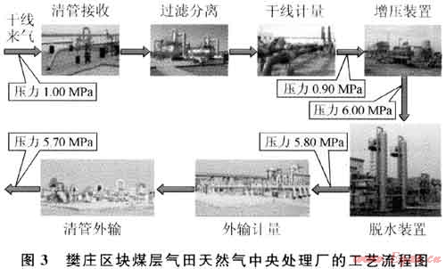 在工程建設(shè)過程中,根據(jù)對煤層地質(zhì)構(gòu)造及煤層氣富集規(guī)律認(rèn)識的不斷深化,適當(dāng)調(diào)整了井位部署。地面集輸工藝建設(shè)采用串接形式,做出了優(yōu)化減少3座集氣站建設(shè)的決定,節(jié)約了建設(shè)投資。圖2為樊莊區(qū)塊煤層氣田集氣站的工藝流程圖。圖3為樊莊區(qū)塊煤層氣田天然氣中央處理廠的工藝流程圖。